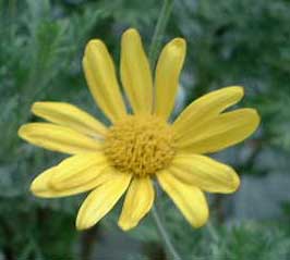 鮮黄色の花が晩秋から春にかけての寒い季節に咲きます。 花形はマーガレットに似た一重咲きです。葉は深い切れ込みがあって細長く、 銀白色をしていますが、黄色の花とのコントラストが美しいものです。